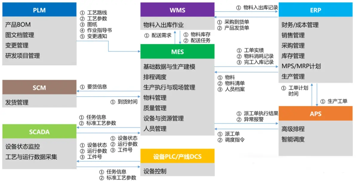BI (商业智能分析平台)、MES(制造执行系统)、ERP(企业资源规划)、SCM(供应链管理)、WMS(仓库管理系统)、APS(高级计划和排程)、SCADA(监控控制与数据获取)、PLM(产品生命周期管理)、QMS(质量管理系统)、CRM(客户关系管理)、EAM(企业资产管理)等系统,各自针对企业不同运营环节提供专门的管理和控制功能。
