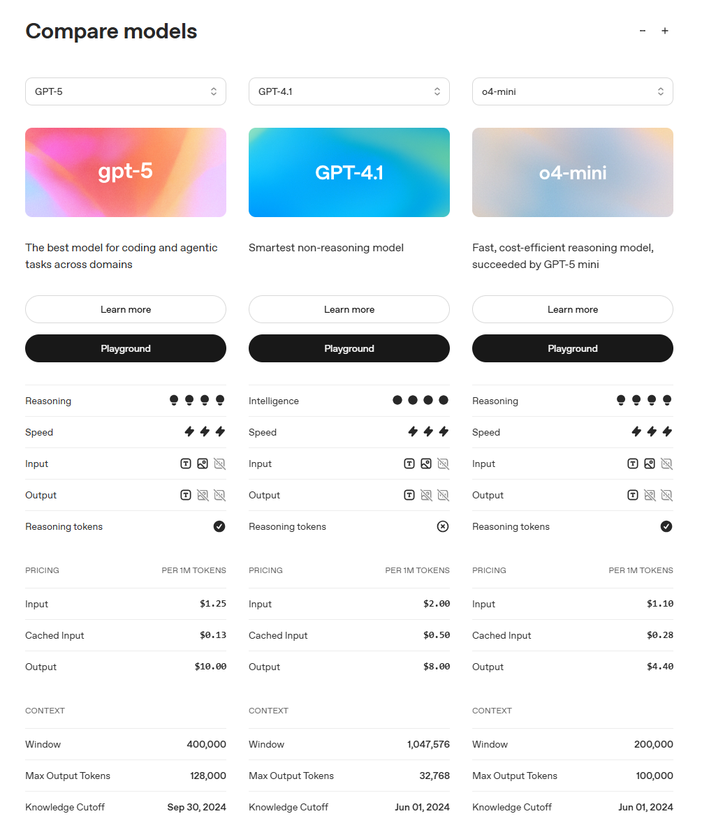 不同模型的能力和成本差异巨大。选择合适的模型是在性能和预算之间取得平衡的关键。OpenAI的定价策略体现了这一点,更强大的模型成本显著更高,这在经济上激励开发者构建更智能的应用架构,例如,通过一个“模型路由器”来根据任务的复杂性将其分配给成本最低且能胜任的模型。简单的分类任务可能被发送到GPT-5 nano,而需要深度推理的复杂问题则被路由到GPT-5。这种基于成本的优化是高级应用设计的核心。