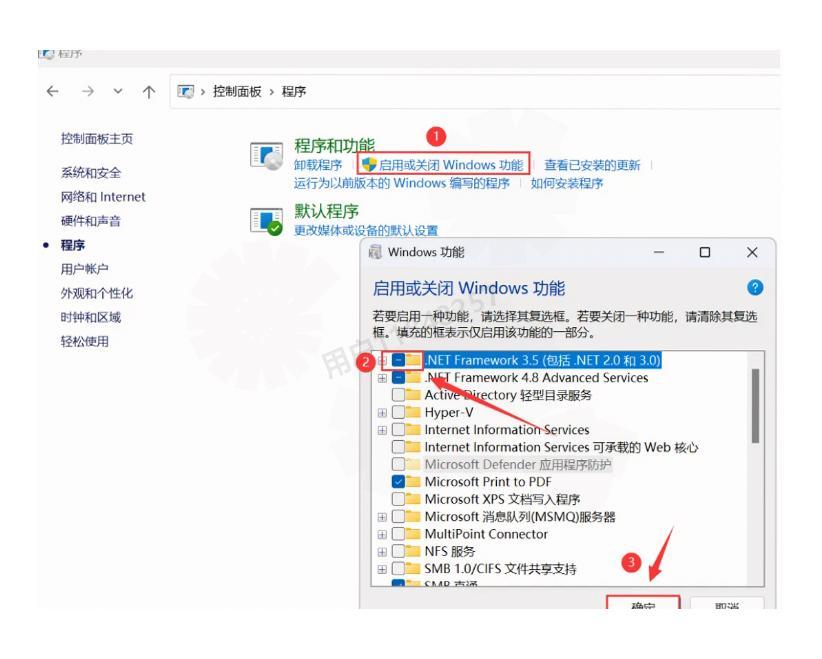 ① 点击"启用或关闭Windows功能" ② 勾选".NET Framework 3.5"选项 ③ 点击【确定】按钮