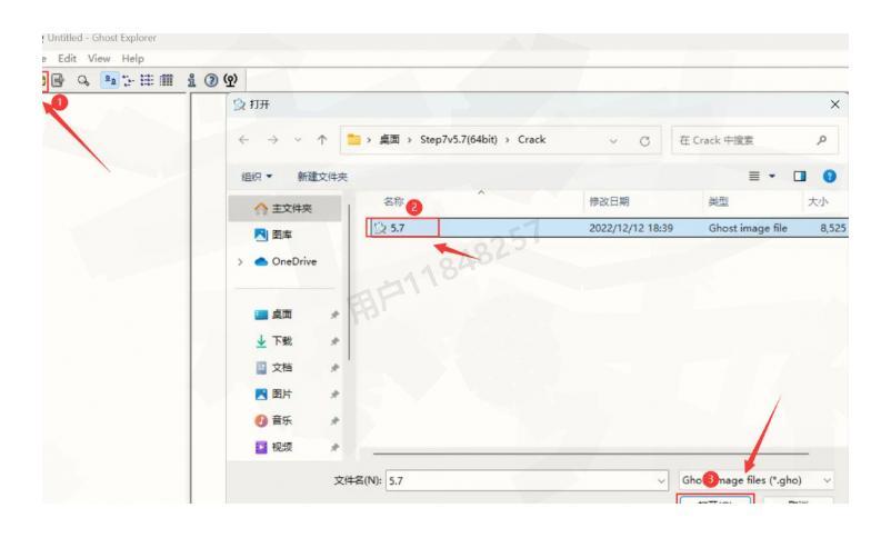 ① 点击左上角的[文件夹图标] ② 从列表中选择[5.7]版本 ③ 点击[打开]按钮