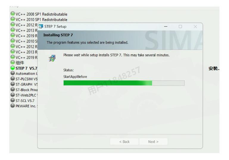 系统开始安装STEP7软件,这个过程可能需要几分钟时间,请耐心等待。