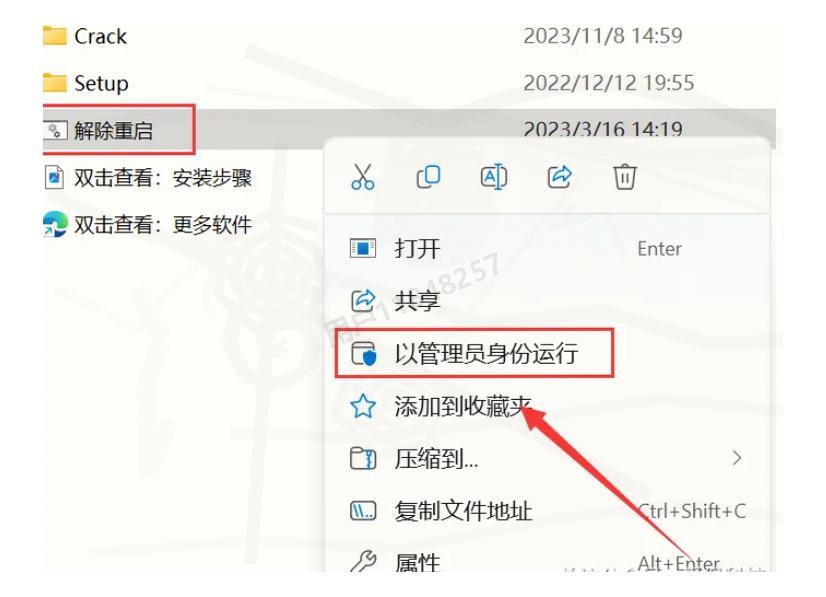 ① 进入解压出来的文件夹 ② 找到"解除重启"文件 ③ 右键点击并选择"以管理员模式启动"