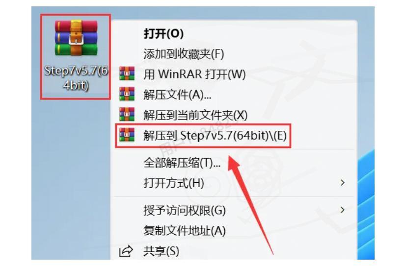 ① 右键点击【Step7v5.7(64bit)】压缩包 ② 选择您已安装的解压工具 ③ 点击【将内容解压至Step7v5.7(64bit)】选项