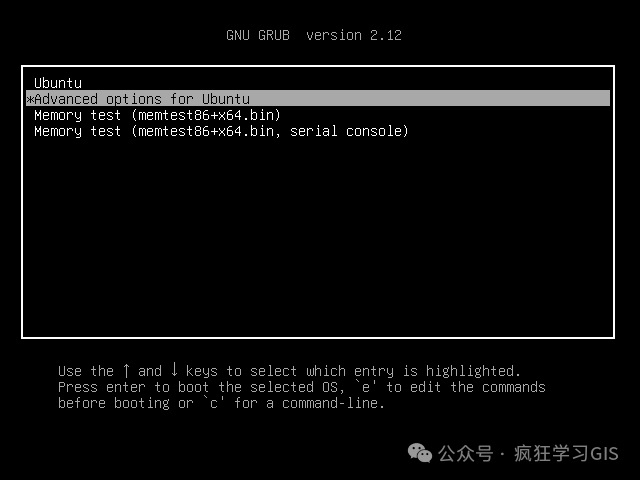 随后,就会出现如下的界面。在其中,通过键盘上的上下方向键,选择“Advanced options for Ubuntu”选项,如下图所示。随后,按下回车键。