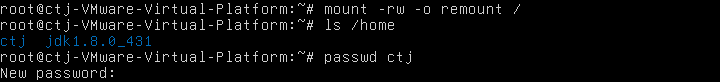 接下来,在命令行中依次输入如下代码。其中,第一句代码是为了获得对根文件系统的写权限,而第二句代码则是列出/home路径下的文件,也就是查看一下我们当前电脑中的用户(这句代码也可以不执行)。