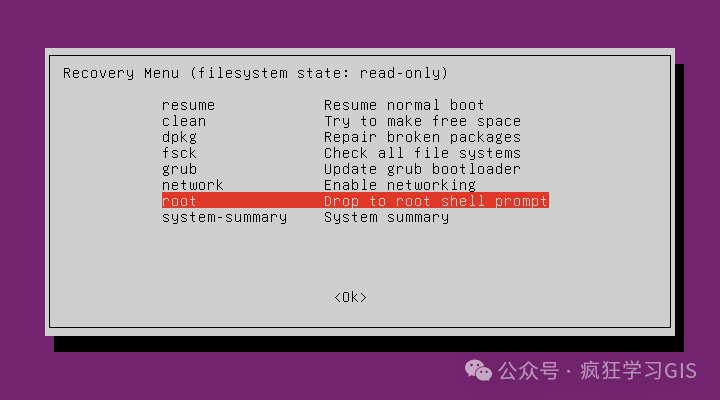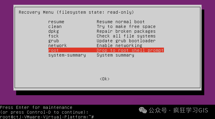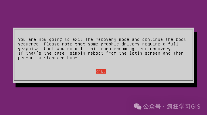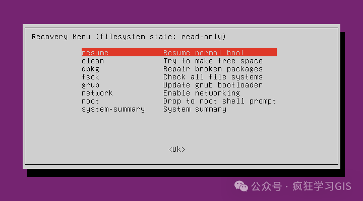 运行上述代码,如下图所示。随后,选择resume那一行,按下回车键,即可退出Recovery Menu。