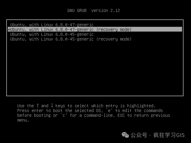 接下来,选择带有(recovery mode)字样的那一行,进入恢复模式;如果有多个(recovery mode)字样的行,建议选择最高版本对应的那一行,如下图所示;随后,同样按下回车键。