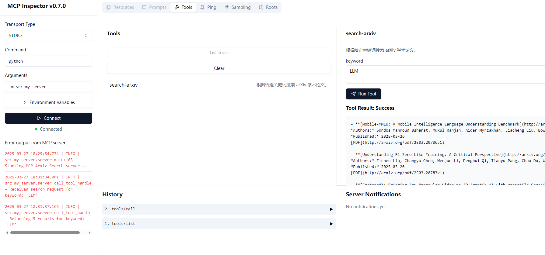 可以看到Tools是我们之前写的工具接口,List Tools是我们写的工具调用处理函数,包含search-arxiv,直接在keyword里面输入关键词,就可以看到服务器响应返回的全部数据了。
