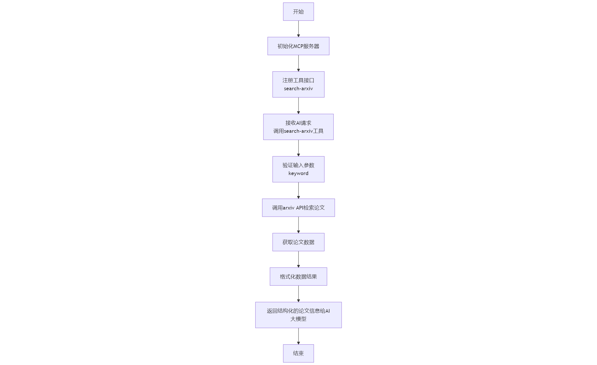 开始 └── 初始化MCP服务器 └── 注册工具接口 (search-arxiv) └── 接收AI请求 (调用search-arxiv工具) └── 验证输入参数 (keyword) └── 调用arxiv API 检索论文 └── 获取论文数据 └── 格式化数据结果 └── 返回结构化的论文信息给AI大模型结束