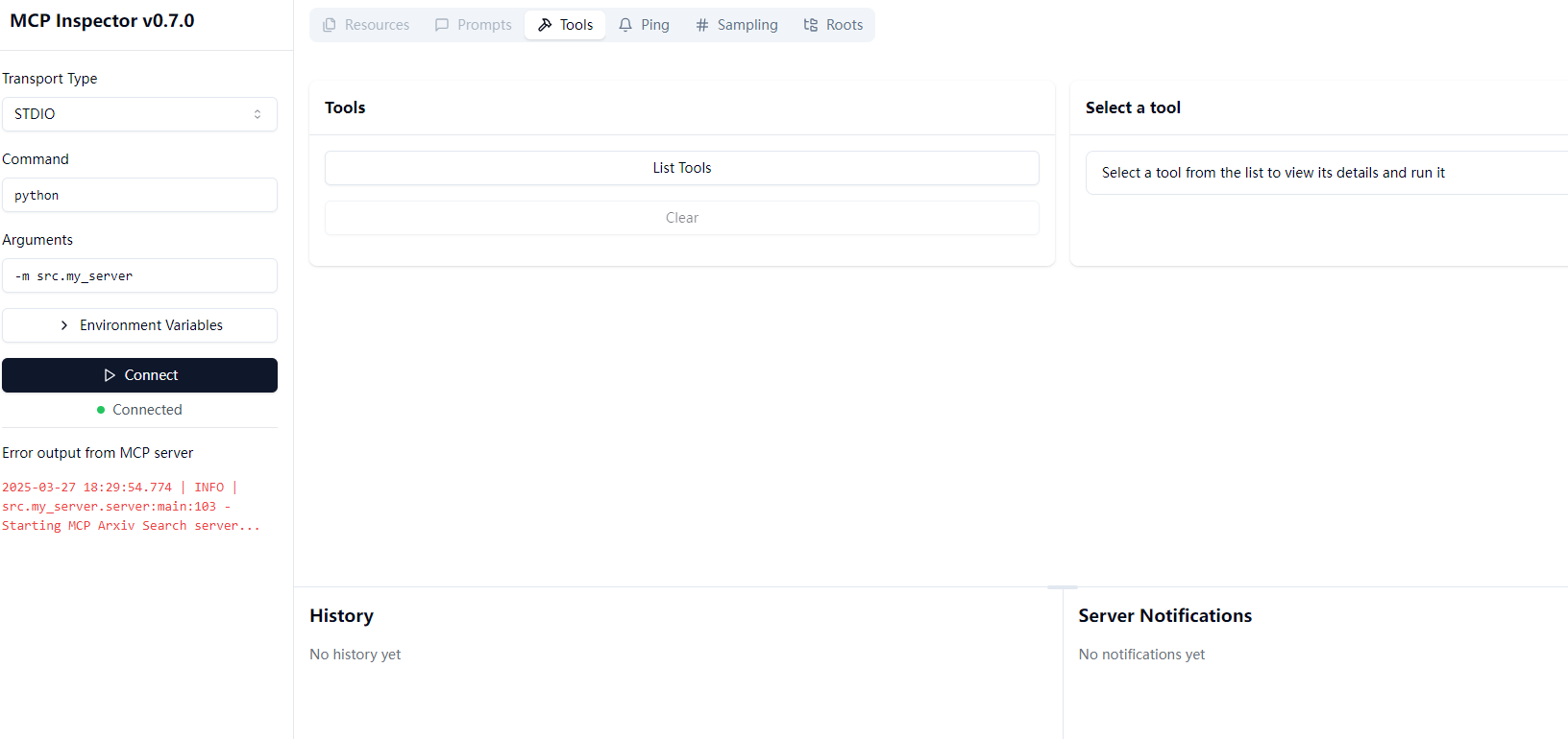 python -m src.my_serverMCP Inspector 提供了一个测试服务器的界面,直接在终端运行即可: