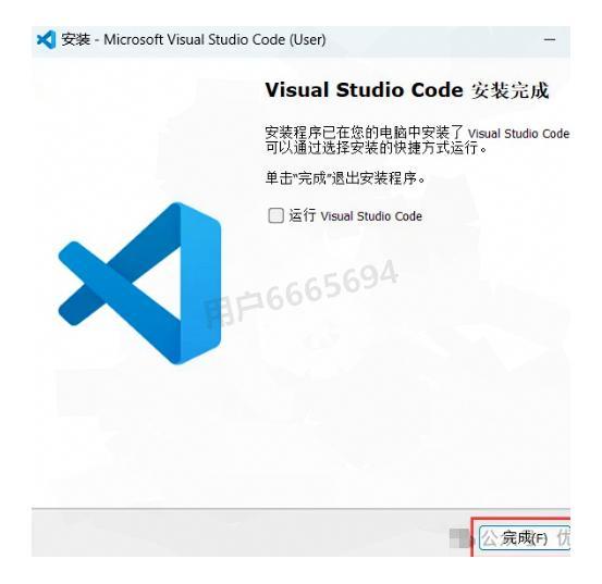 10、安装完成后,我们先不勾选【运行Visual Studio Code】,点【完成】退出安装向导。