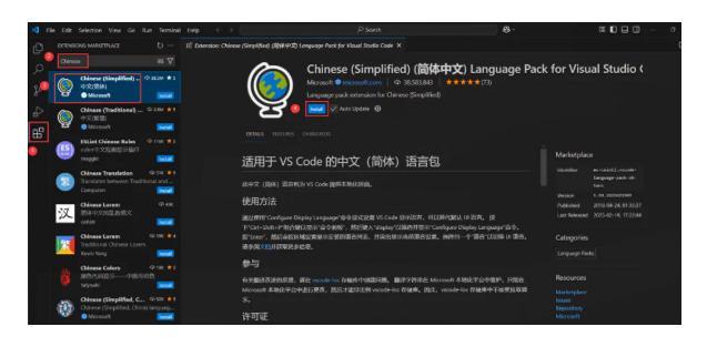 12、第一次使用VS Code,我们先装个中文插件。点击左侧边栏的【插件图标】(像积木的那个),在搜索框输入【Chinese】,找到中文简体插件后点【Install】安装。