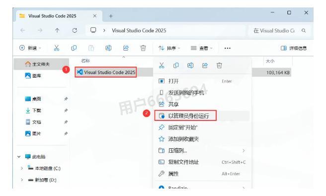 3、找到【Visual Studio Code 2025】程序文件,右键选【以管理员身份运行】,避免后续出现权限问题。