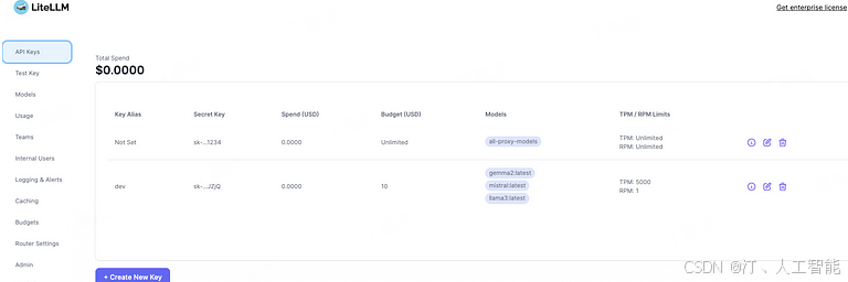 LiteLLM 中的 API 密钥 部分允许用户管理其访问密钥,提供对其使用和预算的详细控制。用户可以创建新密钥、设置别名,并指定消费限额。此外,他们可以为每个密钥分配不同的模型,并定义每分钟令牌数(TPM)和每分钟请求数(RPM)的限制。界面还包括设置最大预算和密钥过期时间的选项。这种细粒度控制确保在使用 LiteLLM 通过各种 LLM 时,资源和成本得到高效管理。