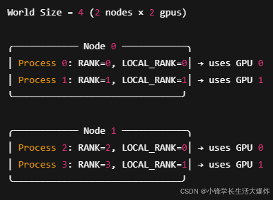 ? node_rank=0 (机器 1) ├── local_rank=0 → RANK=0 └── local_rank=1 → RANK=1 ? node_rank=1 (机器 2) ├── local_rank=0 → RANK=2 └── local_rank=1 → RANK=3