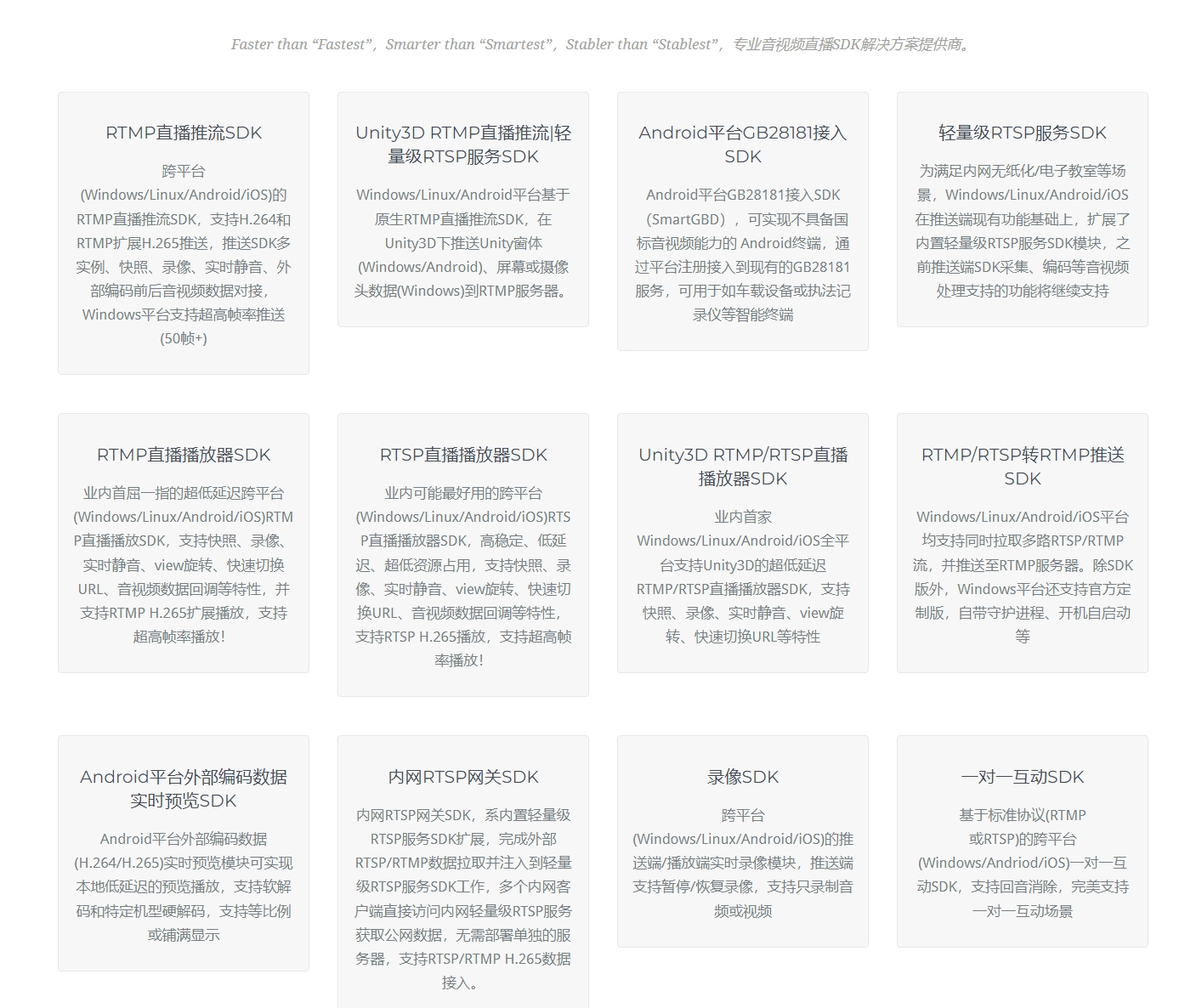 好多客户或开发者跟我们交流的时候,会问我们,为什么不支持HLS、DASH、Smooth Streaming等,其实只要还是核心能力侧重的问题,大牛直播SDK始于2015年,致力于传统行业极致体验的音视频直播技术解决方案,产品涵盖跨平台的实时RTMP推流、RTMP/RTSP直播播放(支持RTSP|RTMP H.265,Enhanced RTMP H.265)、GB28181设备接入、推送端播放端实时录像、多路流媒体转发(RTSP转RTMP,RTMP转RTMP,RTSP|RTMP转GB28181)、音视频导播、动态视频合成、音频混音、一对一互动直播、内置轻量级RTSP服务、RTSP网关服务等,比快更快,业界真正稳定可靠的超低延迟直播SDK(毫秒级延迟,低延迟模式下150~300ms)。