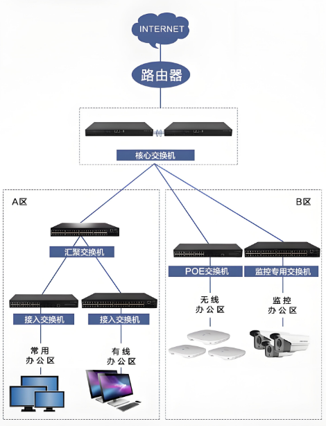 - 接入层用二层实现终端互联,核心层用三层实现策略控制,大二层扩展覆盖多栋建筑。