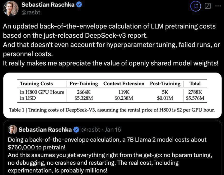 DeepSeek V3的训练总共才用了不到280万个GPU小时,而Llama 3 405B却用了3080万GPU小时。用训练一个模型所花费的钱来说,训练一个DeepSeek V3只需要花费557.6万美元,相比之下,一个简单的7B Llama 3模型则需要花费76万美元。