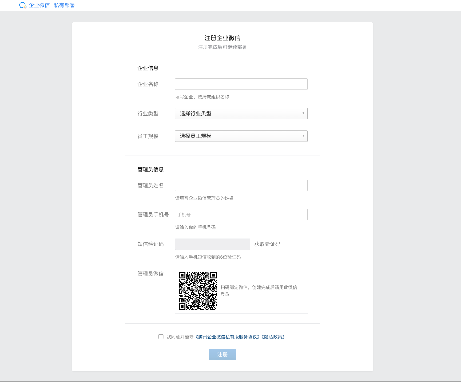 图一为普通企业微信版本注册页面(saas企业微信),图二为企业微信私有化注册信息页面