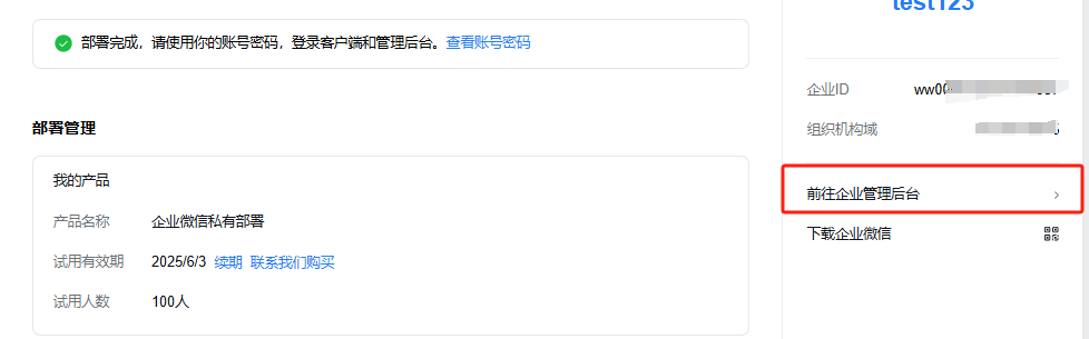 部署完成后可以查看初始账号密码,使用该账号密码可以登录管理后台和客户端进行使用。