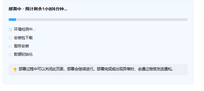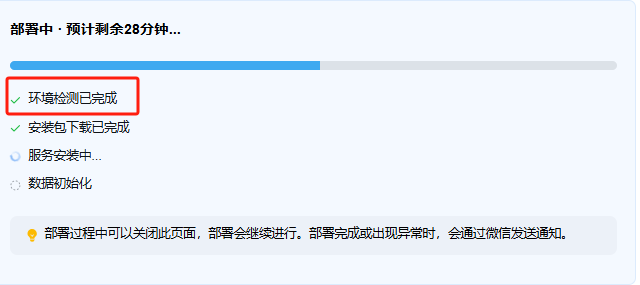 点击“开始部署”按钮,部署中遇到问题或部署成功后,都会通过微信的服务通知下发对应的状态更新通知。