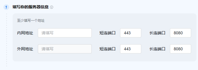 填写服务器的地址,内网地址和外网地址填写一个就可以。后续客户端将根据填写的地址来访问服务器,所以要保证填写的地址是用户的终端可达的。两个地址填写一个即可。
