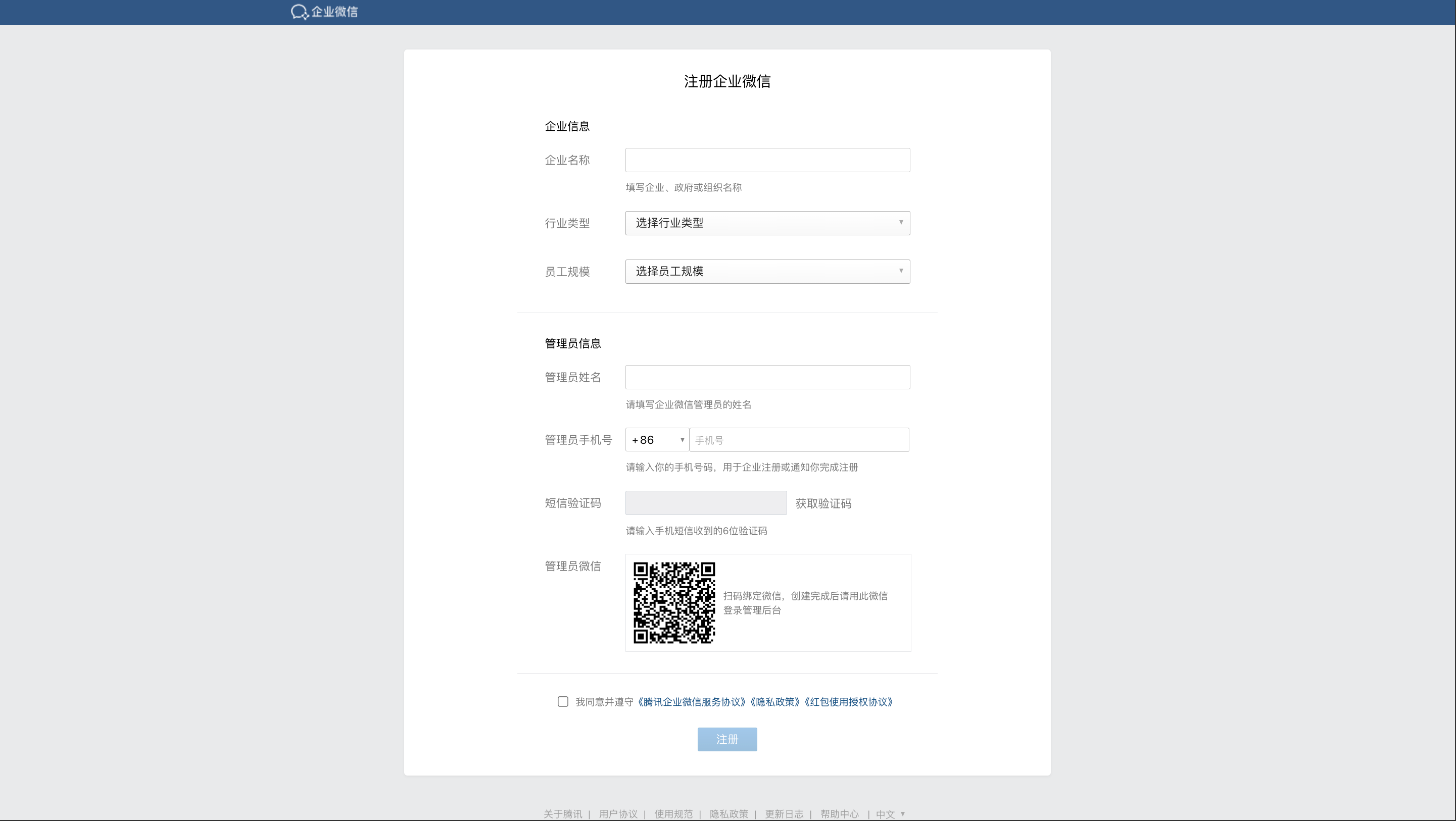 进入后请填写对应企业名称、行业类型、员工规模、管理员姓名,手机号