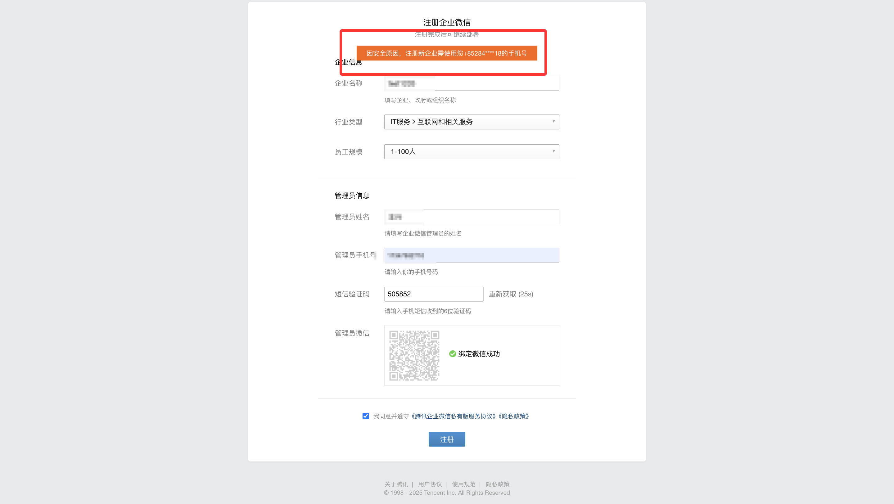 3.提示手机号注册企业需要使用对应微信绑定的手机号。提示信息:因安全原因,注册信企业需使用您+86 ******的手机号。这里需要使用微信绑定的手机号进行注册