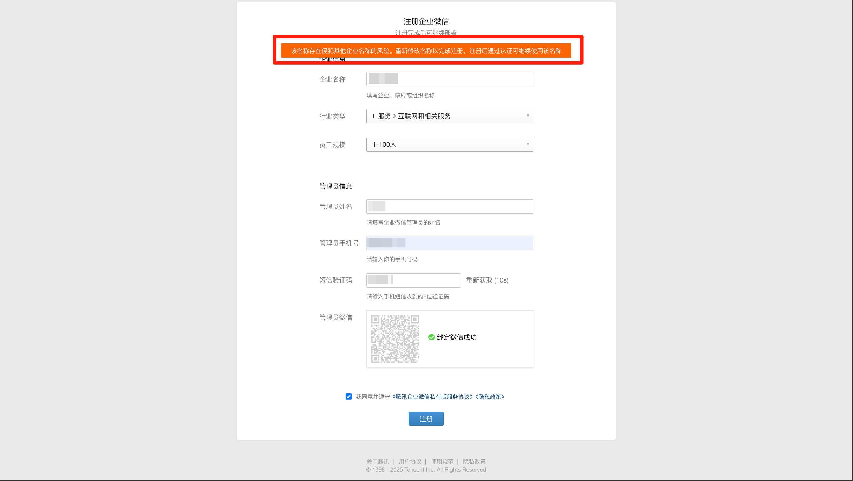 1.填写已经在saas中已经认证成功的企业微信名称,则回提示:该名称存在侵犯其他企业名称的风险。重新修改名称以完成注册,注册后通过认证可继续使用该名称,报错信息如下图