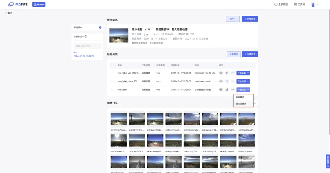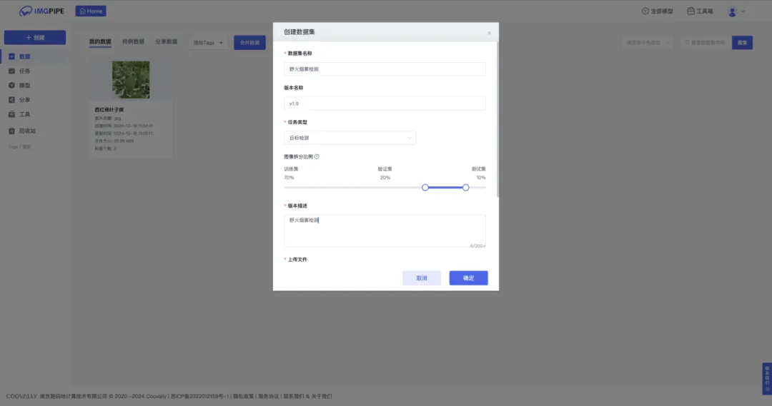 进入【图像数据】页面,点击创建数据集,输入数据集名称、描述,选择任务类型,上传压缩包文件。创建数据集时可以按照比例拆分训练集、验证集、测试集。