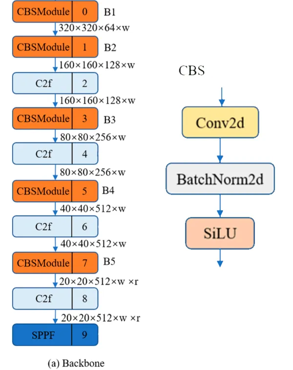 Backbone改进:YOLOV5中的C3模块被替换成了C2f模块,实现了进一步的轻量化。同时保持了CSP的思想,保留了YOLOv5等架构中使用的SPPF(空间金字塔池化)模块。整个YOLOv8的Backbone由CBS、C2f、SPPF三种模块组成。让YOLOv8可以在保证轻量化的同时获得更加丰富的梯度流信息。