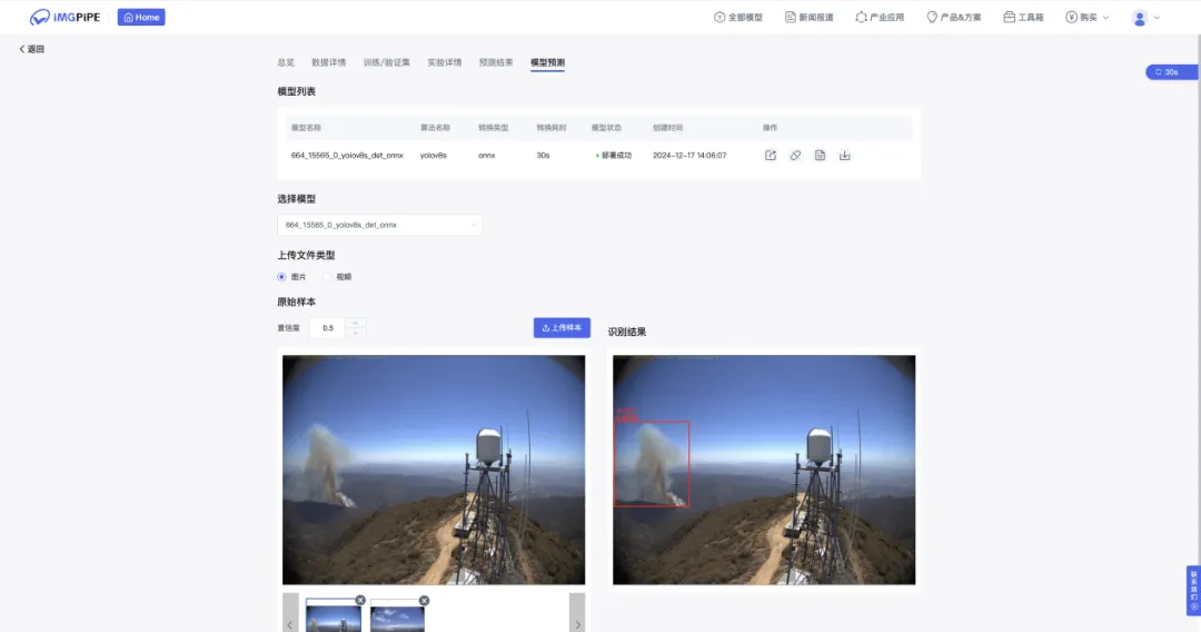 模型训练完成后,完成模型转换与模型部署后,即可上传图片进行结果预测。完成后还可以将模型下载与分享。