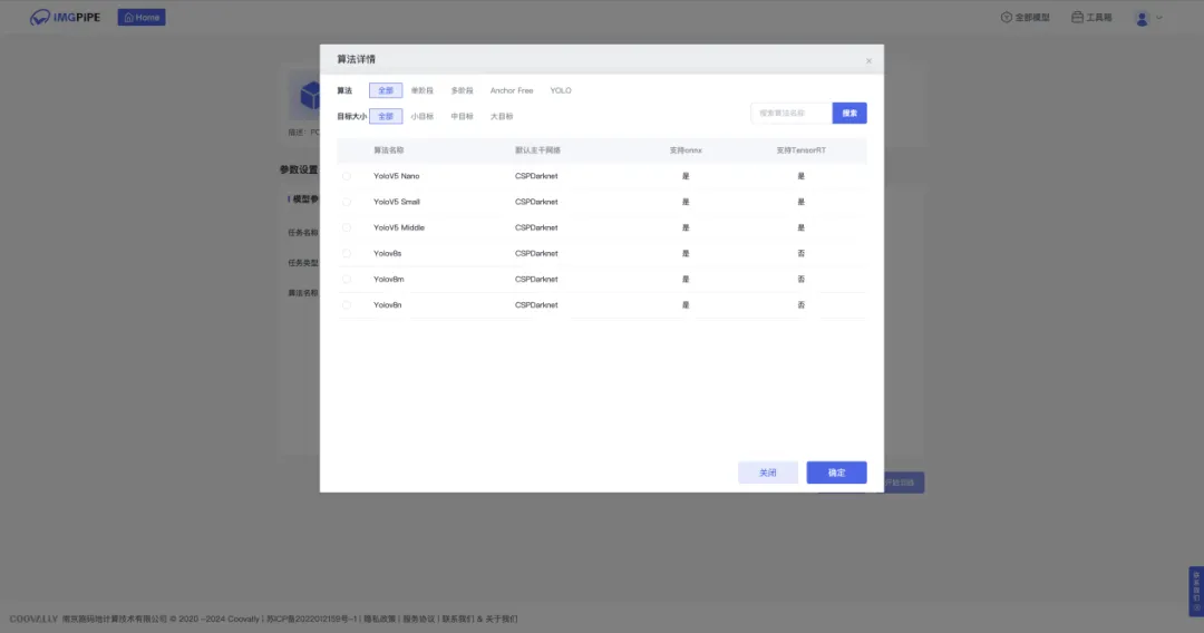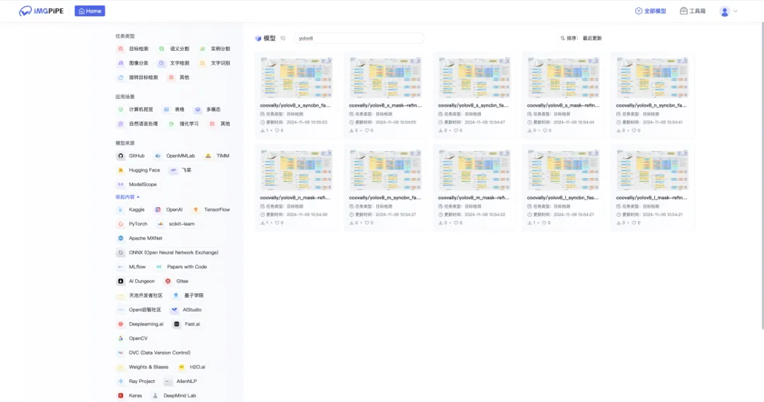 进入Coovally平台点击【全部模型】,搜索YOLOv8,在这里可以选择不同的YOLOv8版本。下载代码包或者点击另存为我的模型。进入【模型集成】页面,进行安装。