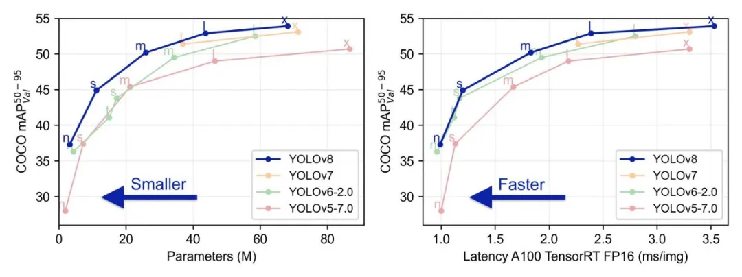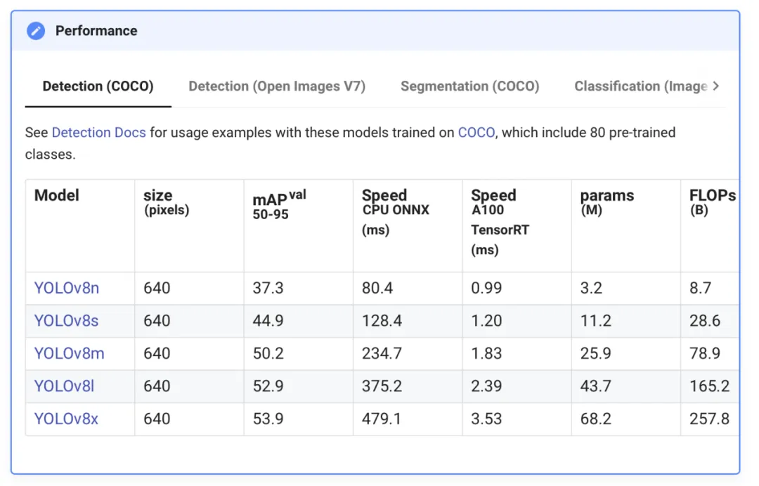 YOLOv8是个模型簇,从小到大包括:YOLOv8n、YOLOv8s、YOLOv8m、YOLOv8l、YOLOv8x等。模型参数、运行速度、参数量等详见下表: