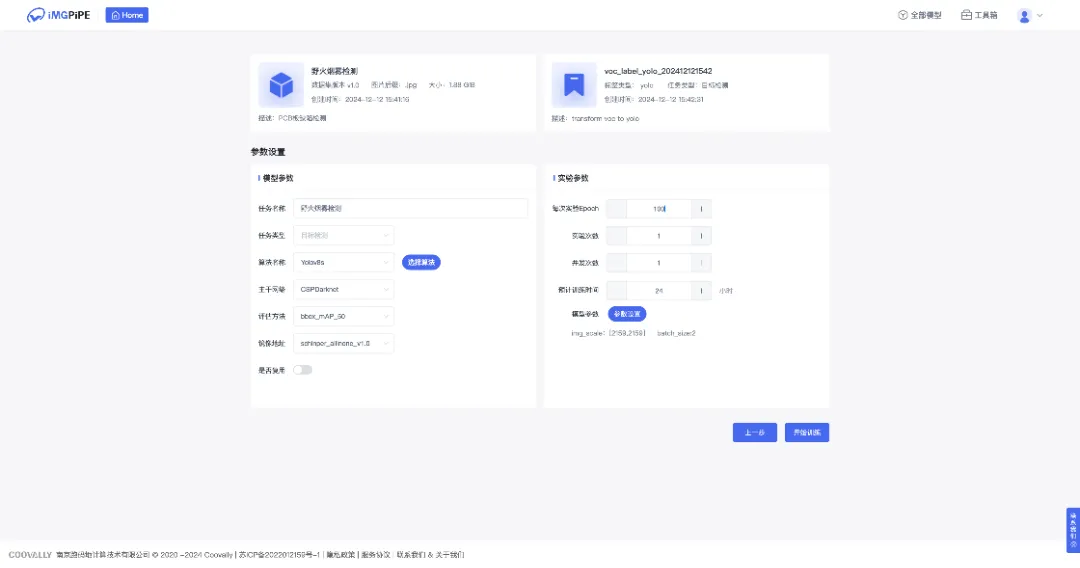 进入数据集详情页,输入任务名称,选择模型配置模版,设置实验E-poch次数,训练次数等信息,即可开始训练。