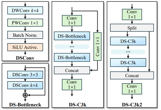 采用了大量深度可分离卷积(DSConv),大幅减少模型参数和计算量,特别适合边缘设备部署。
