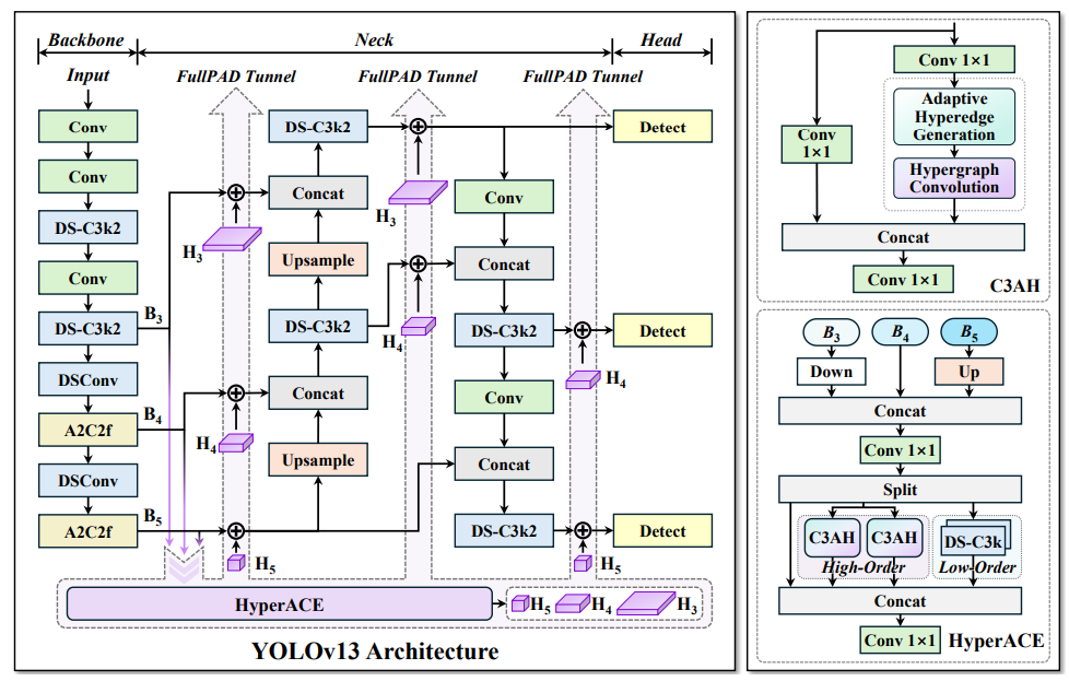 YOLOv13 不再满足于传统的 “Backbone → Neck → Head” 三段式信息流。
