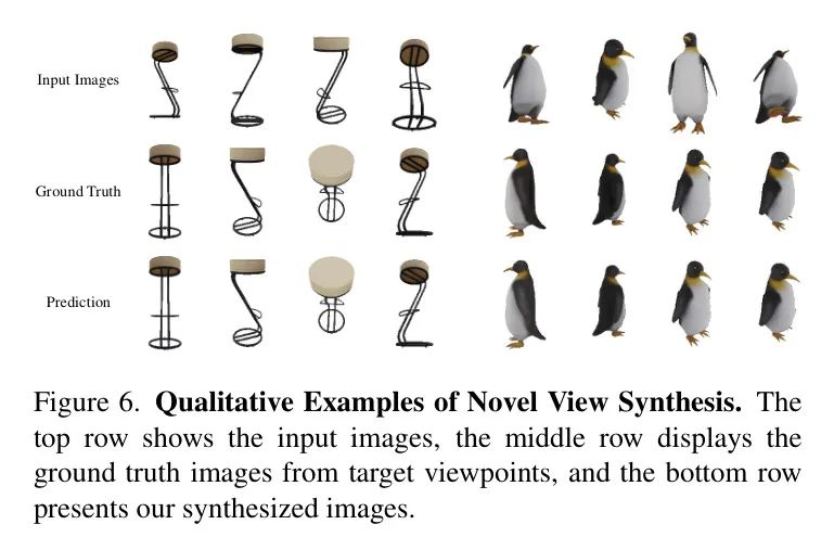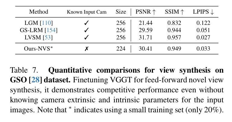 LVSM 在 Objaverse 数据集 [20] 上进行了训练。作者使用了一个内部数据集,大约为 Objaverse 数据集规模的 20%。有关训练和评估的更多细节请参阅 [53]。如表7 所示,尽管作者的模型不需要输入相机参数,并且使用的训练数据量少于 LVSM,但作者在 GSO 数据集 [28] 上仍取得了具有竞争力的结果。作者预计使用更大的训练数据集可以获得更好的结果。定性结果如图6 所示。