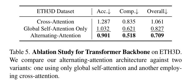 特征 Backbone 网络。作者首先通过将其与两种替代注意力架构进行比较来验证作者提出的交替注意力设计的有效性:(a) 仅全局自注意力,以及(b) 交叉注意力。为了确保公平比较,所有模型变体都保持相同的参数数量,共计使用了 层注意力层。对于交叉注意力变体,每个帧独立地对所有其他帧的 Token 进行注意力关注,尽管这极大地增加了运行时间,特别是在输入帧数增加时。超参数,如隐藏维度和头的数量都保持一致。点图估计准确性被选作作者的消融研究中的评估指标,因为它反映了模型对场景几何结构和相机参数的联合理解能力。表5 的结果表明,作者的交替注意力架构在两个 Baseline 变体上取得了明显的优势。此外,作者其他的初步探索性实验始终显示,使用交叉注意力的架构通常在性能上逊色于仅使用自注意力的架构。