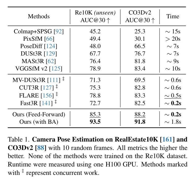 可微BA。作者还探讨了使用可微束调整的想法,类似于VGGSfM [125]。在小型初步实验中,可微BA展示了良好的性能。然而,在训练过程中其计算成本是一个 Bottleneck 。使用Theseus [85] 在PyTorch中实现可微BA通常会使每个训练步骤大约慢四倍,这在大规模训练中代价高昂。虽然定制一个框架以加速训练可能是潜在的解决方案,但这超出了本工作的范围。因此,作者在本工作中未包含可微BA,但认识到它是一个值得探索的方向,尤其是在大规模无监督训练场景中,它可以作为缺乏显式三维标注情况下的有效监督信号。