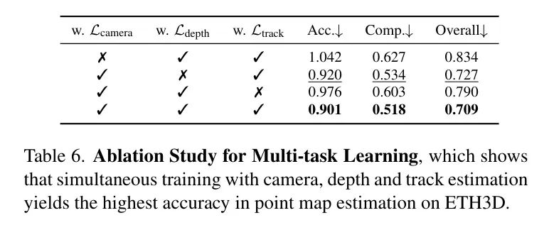 多任务学习。作者还验证了训练单个网络以同时学习多个3D量的好处,即使这些输出之间可能存在重叠(例如,同时估计深度图和相机参数可以生成点云)。如表6所示,如果不进行相机、深度或跟踪估计的训练,点云估计的准确性会出现显著下降。值得注意的是,整合相机参数估计明显提升了点云的准确性,而深度估计仅带来微小的改进。