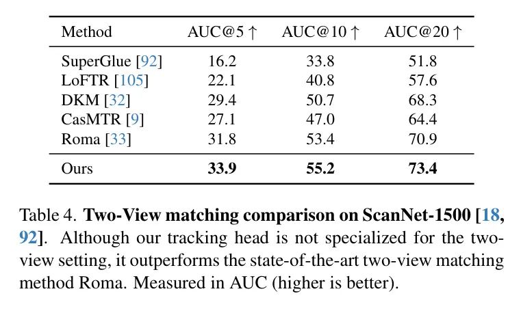 双视图图像匹配是一个在计算机视觉中广泛研究的主题[68, 93, 105]。它代表了刚性点跟踪的一个特例,仅限于两个视角,因此是一个适合衡量跟踪精度的良好评估基准,尽管作者的模型并不专门针对这一任务进行训练。作者在ScanNet数据集[18]上遵循标准协议[33, 93],并在表4中报告结果。对于每对图像,作者提取匹配并使用它们来估计一个本质矩阵,该矩阵随后被分解为相对摄像机姿态。最终的度量标准是通过AUC测量的相对姿态准确性。为了评估,作者使用ALIKED[158]检测关键点,并将其视为 Query 点。然后将这些点传递给作者的跟踪分支,以在第二个帧中找到对应关系。作者采用来自Roma[33]的评估超参数(例如匹配数、RANSAC阈值)。尽管VGGT未明确针对双视图匹配进行训练,表4显示它在所有基准模型中达到了最高的准确性。