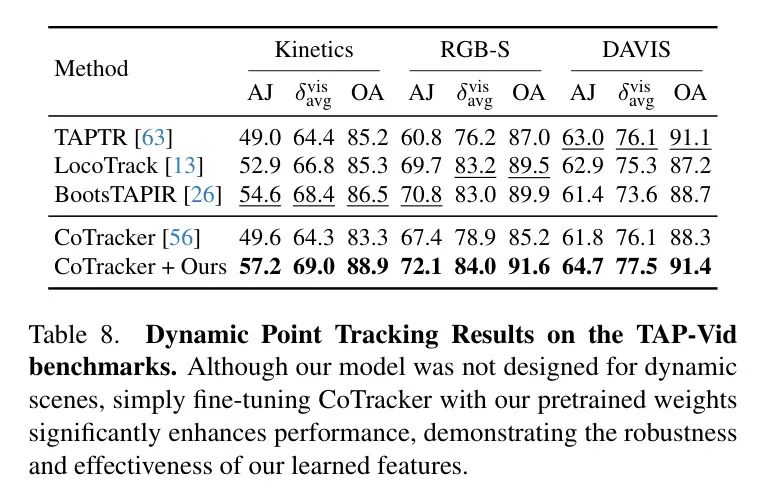 动态点追踪近年来已成为一项极具竞争力的任务[25, 44, 57, 136],并且作为作者学习特征的另一个下游应用。遵循标准做法,作者报告了这些点追踪指标:遮挡准确率(OA),它包含遮挡预测的二元准确率;,它是准确追踪在特定像素阈值内的可见点的比例均值;以及平均交并比(AJ),用于测量追踪和遮挡预测的准确性。