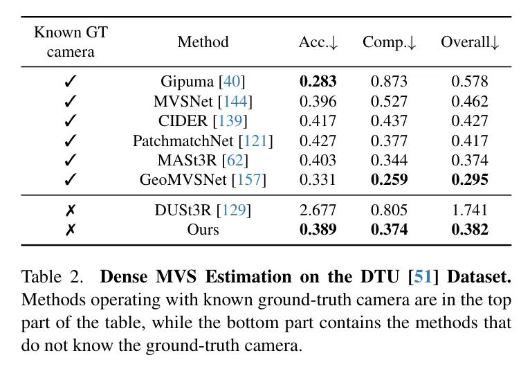 在 MASt3R [62] 的基础上,作者进一步在 DTU [51] 数据集上评估了作者的多视图深度估计结果。作者报告了标准的 DTU 评价指标,包括准确性(预测到 GT 最小欧氏距离)、完备性(GT 到预测最小欧氏距离),以及它们的平均值(即,平均 chamfer 距离)。在表2 中,DUSt3R 和作者的 VGGT 是唯一两种不依赖于 GT 相机知识的方法。MASt3R 通过使用 GT 相机进行三角化匹配来生成深度图。与此同时,像 GeoMVSNet 这样的深度多视图立体方法则利用 GT 相机构建成本体积。