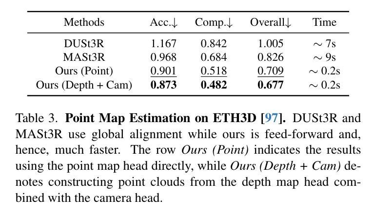 作者还将作者的预测点云精度与DUSt3R和MASt3R在ETH3D [97] 数据集上的结果进行了比较。对于每个场景,作者随机抽取了10帧。预测的点云通过Umeyama [117] 算法与真实值对齐。使用官方的 Mask 过滤掉无效点后报告结果。作者报告了点图估计中的准确率、完备度以及总体性能(基于均方根点距)。如表3所示,尽管DUSt3R和MASt3R执行了昂贵的优化(全局对齐——每场景约10秒),但在简单的前馈过程中,作者的方法在重建仅需0.2秒的情况下仍然显著优于它们。