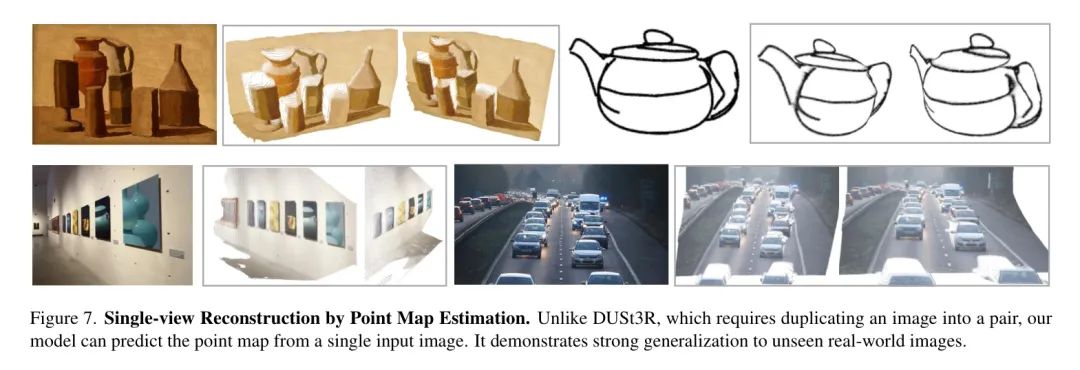 单视角重建。与DUSt3R和MASt3R等系统需要复制图像以创建图像对的做法不同,作者的模型架构本身支持单张图像作为输入。在这种情况下,全局注意力自然会转换为帧内注意力。尽管作者的模型并未专门针对单视角重建进行训练,但它表现出令人惊讶的好效果。一些示例可以在图3和图7中找到。作者强烈建议尝试作者的演示以获得更好的可视化效果。
