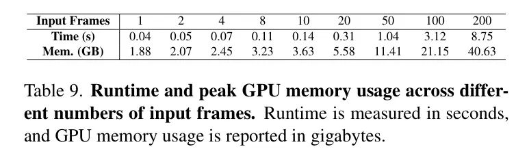 运行时间和内存使用情况。如表9所示,作者评估了处理不同数量输入帧时特征主干网络的推理运行时间和峰值GPU内存使用量。测量使用的是单块NVIDIA H100 GPU,并结合了v3级闪存注意力机制[98]。图像分辨率为336×518像素。作者重点关注与特征主干网络相关的成本,因为用户可以根据自身具体需求和可用资源选择不同的分支组合。摄像机头相对轻量,通常占据运行时间的大约5%,以及特征主干网络所用GPU内存的大约2%。一个DPT头平均每帧使用0.03秒和0.2 GB的GPU内存。