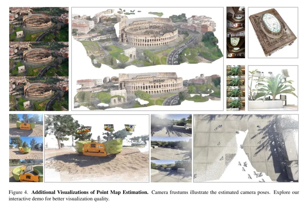作者在图3和图4中提供了与DUSt3R的定性比较,展示的是野外场景。VGGT输出高质量的预测,并且泛化能力很强,尤其在油画、不重叠帧以及沙漠等重复或均质纹理的场景等具有挑战性的离域示例中表现优异。