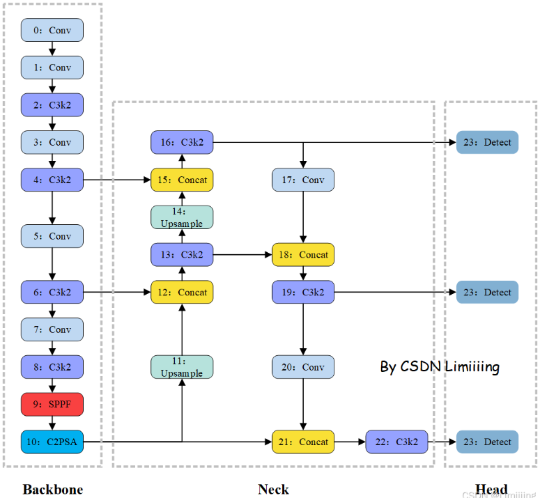 backbone:定义了模型的骨干网络。[from, repeats, module, args]:这是每个网络层的定义格式。from表示输入来自哪一层,repeats表示该模块重复的次数,module表示模块名称,args表示模块的参数。- [-1, 1, Conv, [64, 3, 2]]:表示输入来自上一层(-1),该卷积层(Conv)重复一次,参数为输入通道数 64、卷积核大小 3、步长为 2,参数来自Conv模块的定义。后面的注释0-P1/2分表表示第0层,P1特征图,2倍下采样。C3k2 是新提出的模块,SPPF 是空间金字塔池化快速(Spatial Pyramid Pooling - Fast)模块。head:定义了模型的头部结构。- [-1, 1, nn.Upsample, [None, 2, "nearest"]]:表示使用最近邻插值上采样,参数分别为输入张量(None 表示根据输入自动确定)、上采样因子 2 和插值方法为“nearest”。[[-1, 6], 1, Concat, [1]]:表示将当前层(-1)和第 6 层进行拼接(Concat),参数 1 表示在通道维度上进行拼接。C3k2、Conv 和 Detect 等模块也类似解释,Detect 模块最后接收类别数量 nc,表示进行目标检测操作,接收 P3、P4、P5 三个不同尺度的特征图进行检测。结构图的绘制主要通过模块所在的层数和层于层之间的连接而来。