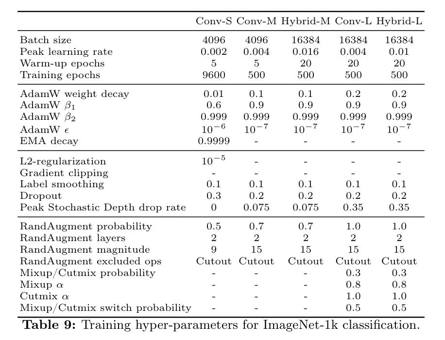 为了提升模型性能,作者的训练方法融合了广泛采用的数据增强技术和正则化方法。在数据增强方面,作者使用了Inception裁剪,水平翻转,RandAugment,Mixup,以及CutMix。在正则化方面,作者应用了L2规范化和随机深度丢弃。增强和正则化的强度根据模型大小进行调整,具体细节见表9。